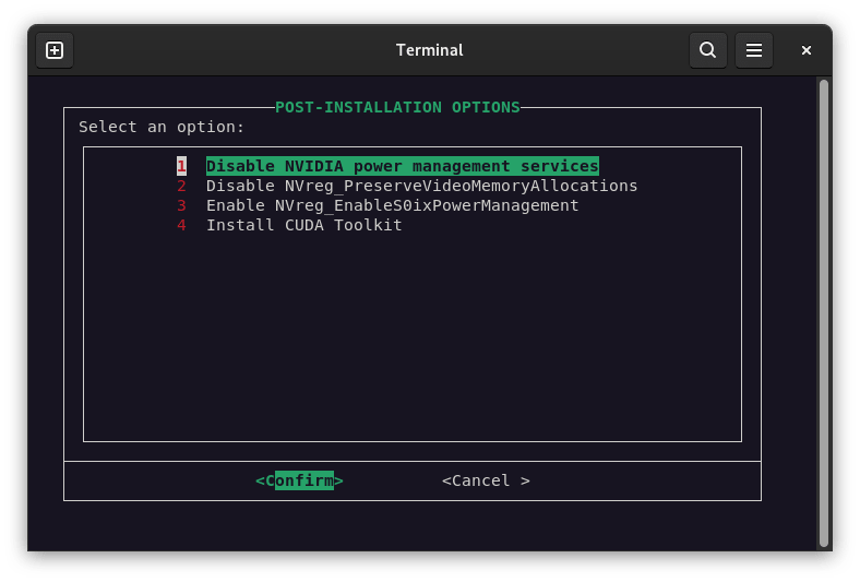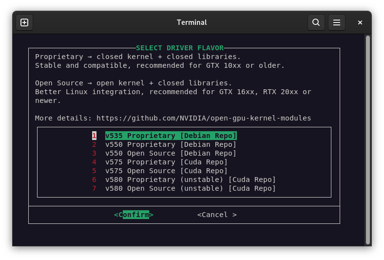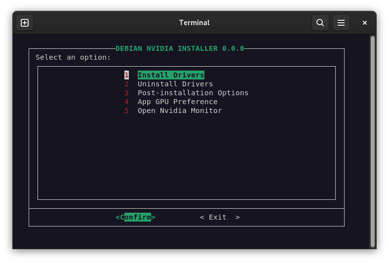 Bash TUI ile NVIDIA sürücü yükleyici. Bu araç, etkileşimli metin tabanlı arayüz (TUI) kullanarak Debian'a NVIDIA sürücülerini yüklemenizi sağlar. Paket yükleme, uyumluluk kontrolleri ve grafik ortamı yapılandırması gibi adımları otomatikleştirir.
