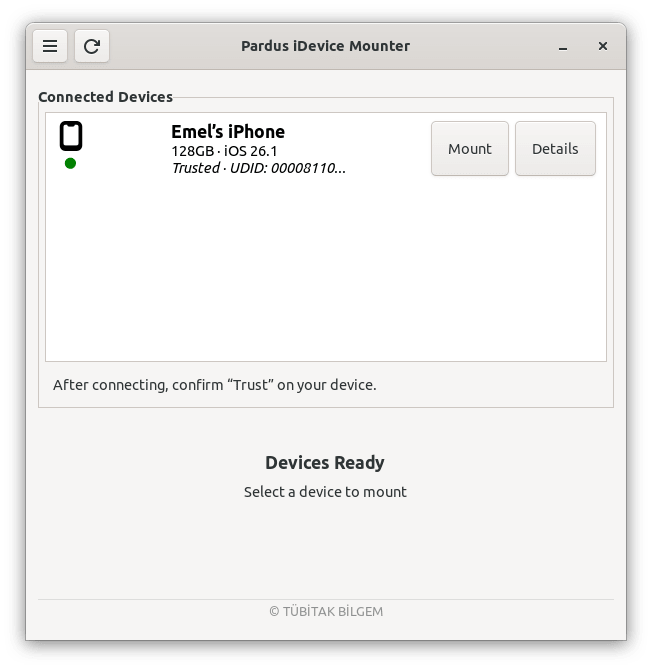 Pardus iDevice Mounter, Linux bilgisayarınızdan iPhone veya iPad'inizdeki dosyalara bağlanmanıza ve erişmenize yardımcı olan basit bir uygulamadır. Cihazınızı takıp "bağla"ya tıklamanız ve dosyalarınıza normal bir klasör gibi göz atmanız yeterlidir.